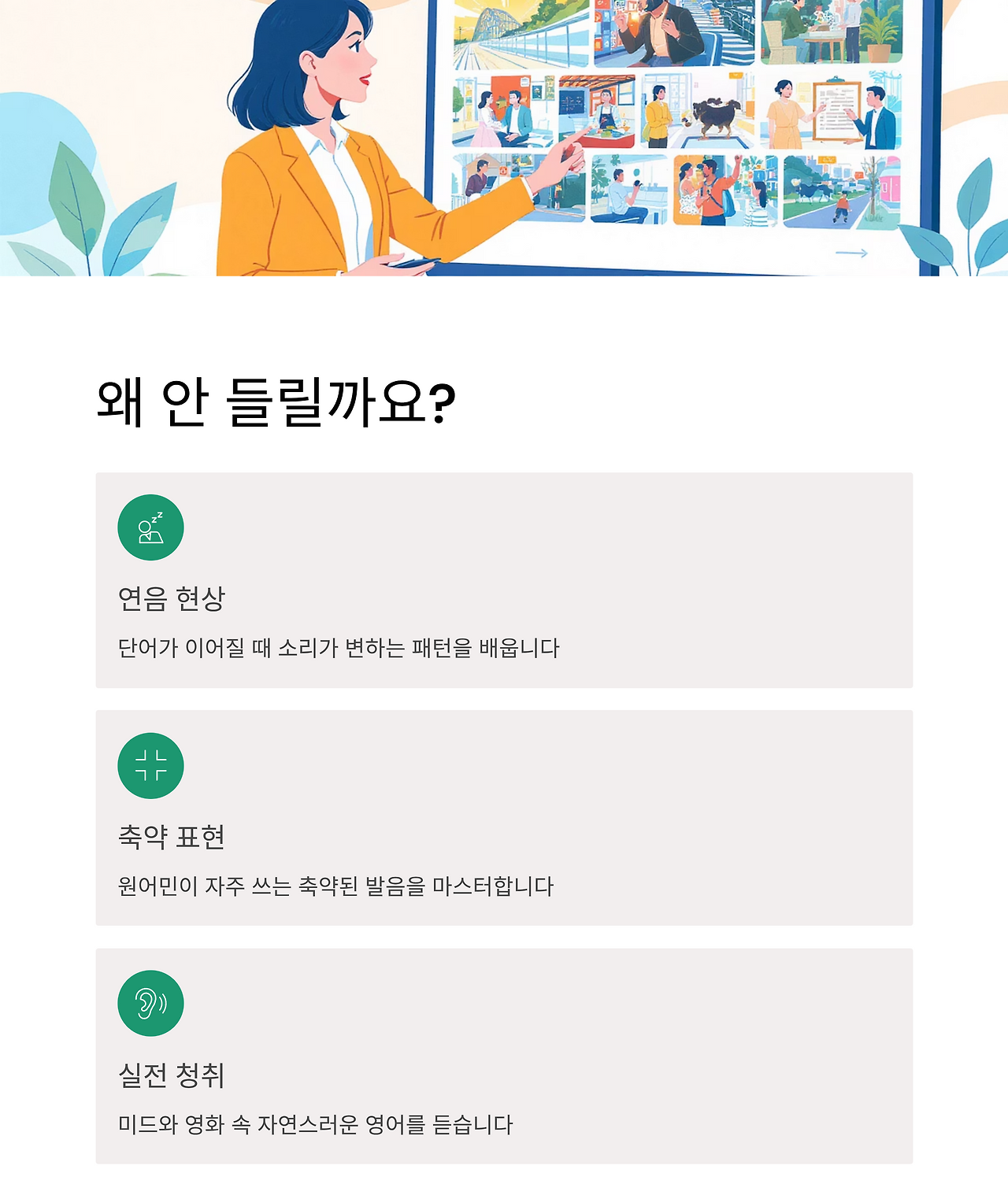 단순히 반복해서 듣는 것에서 그치지 않고, 안 들리는 소리를 스스로 잡아낼 수 있는 '기술'을 가르쳐 줍니다.