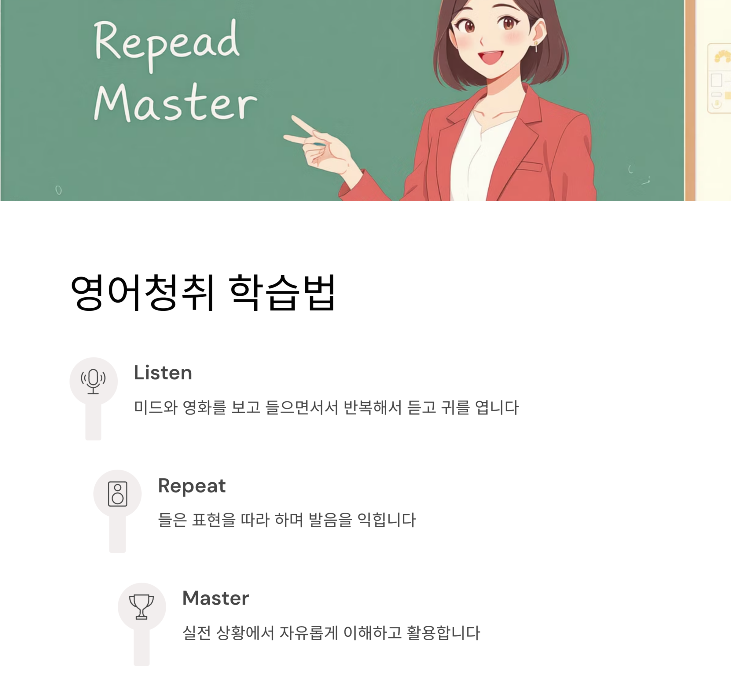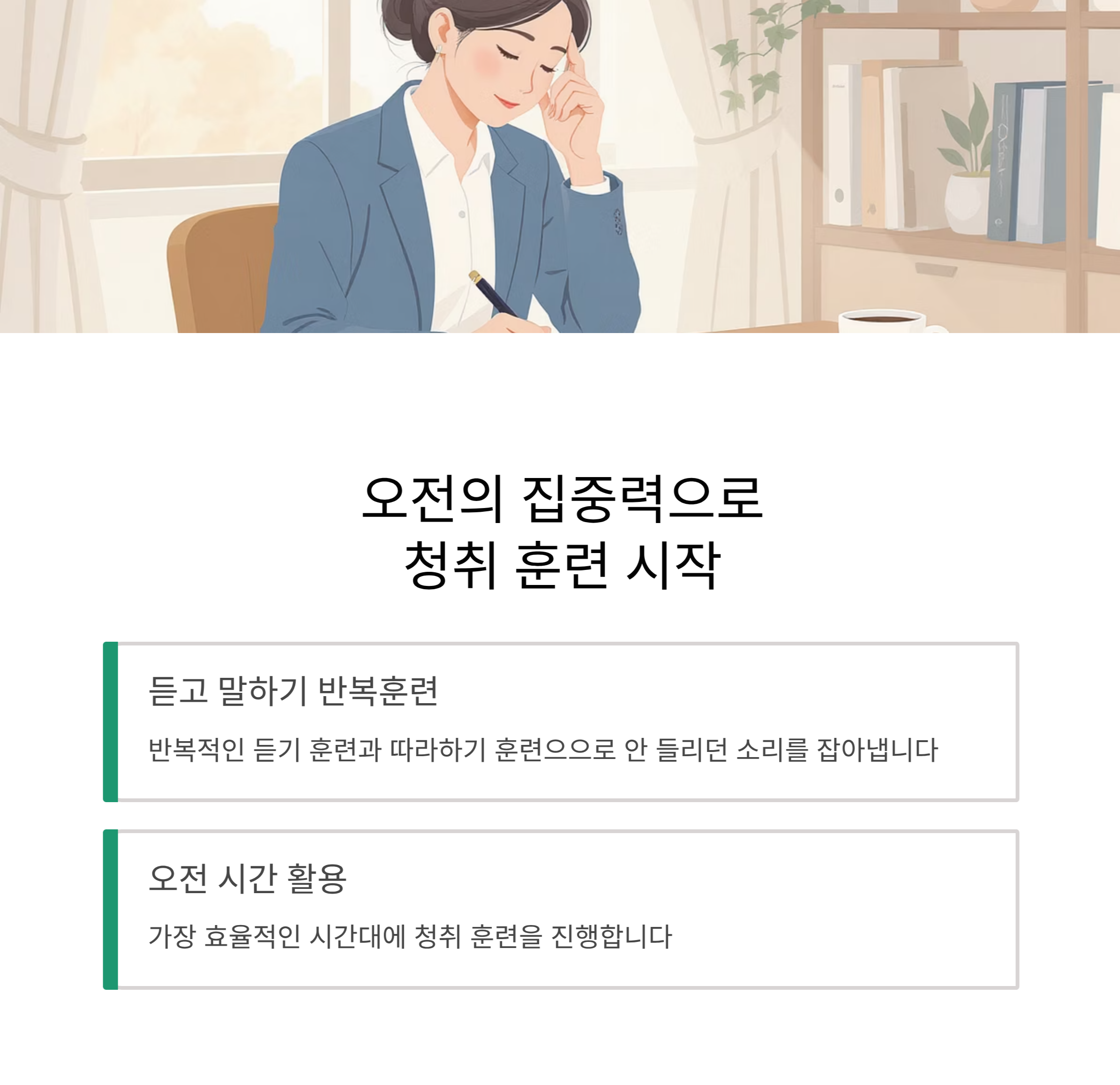- 습관화: 주 3회 루틴으로 청취력 강화를 생활의 일부로 만듦.