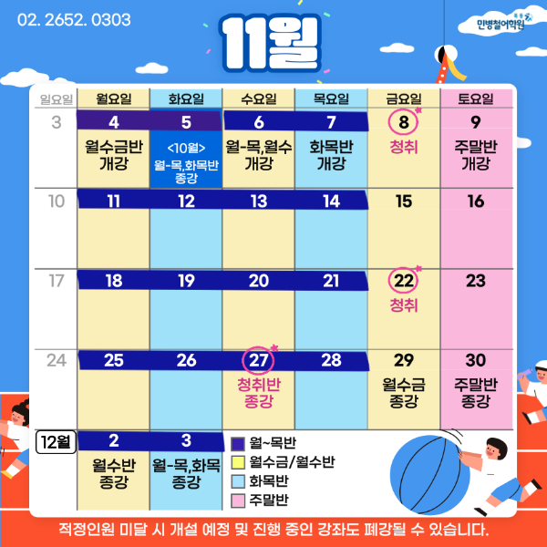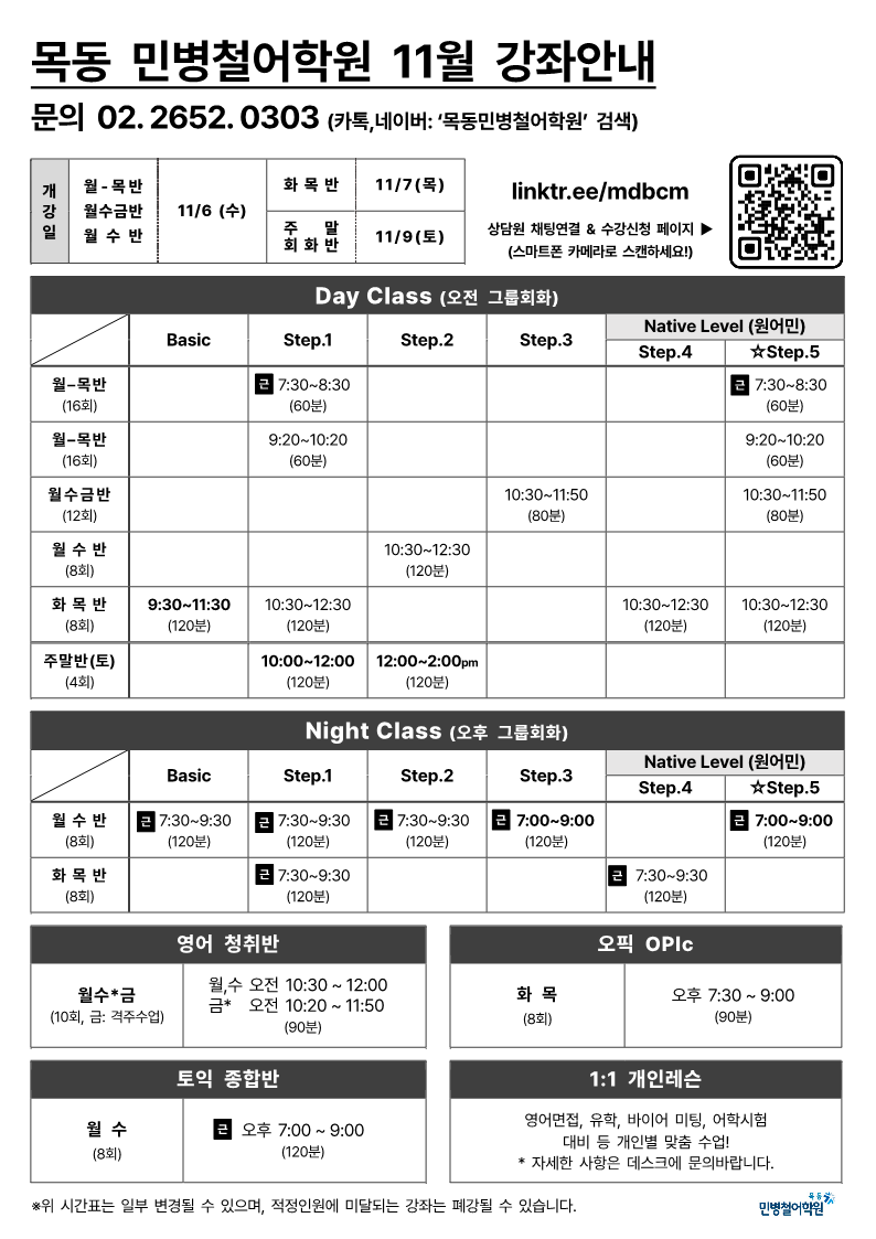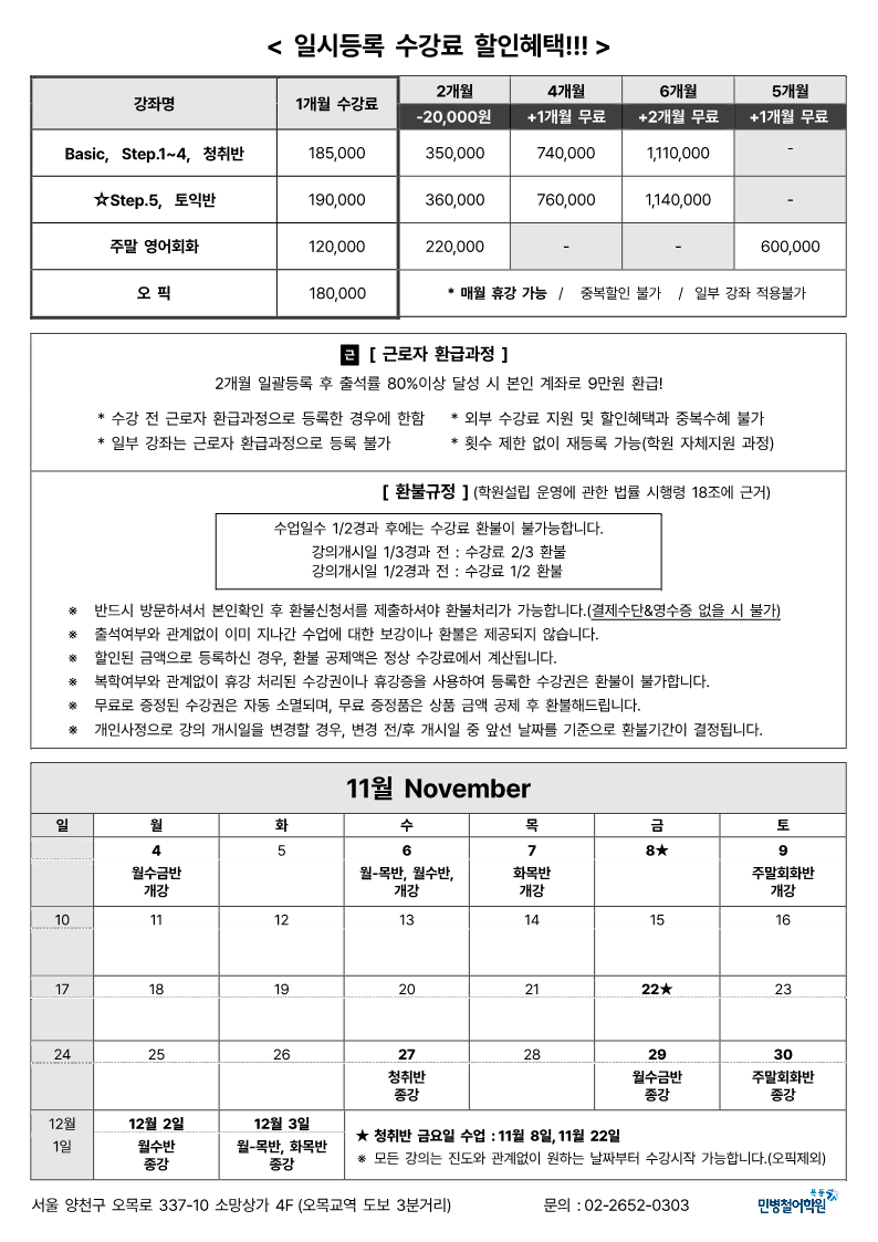 목동영어회화 민병철어학원 목동점 11월 강의일정 안내해드리겠습니다:)