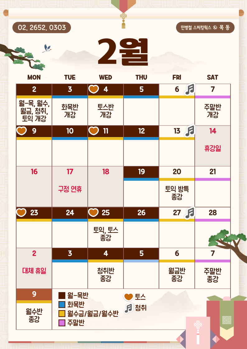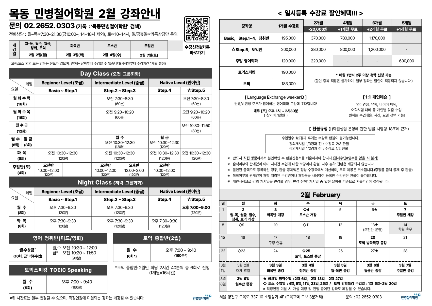바로 개강일이죠. 목동 민병철어학원의 2월은 과목별로 개강일이 다르니 스케줄 확인은 필수예요.